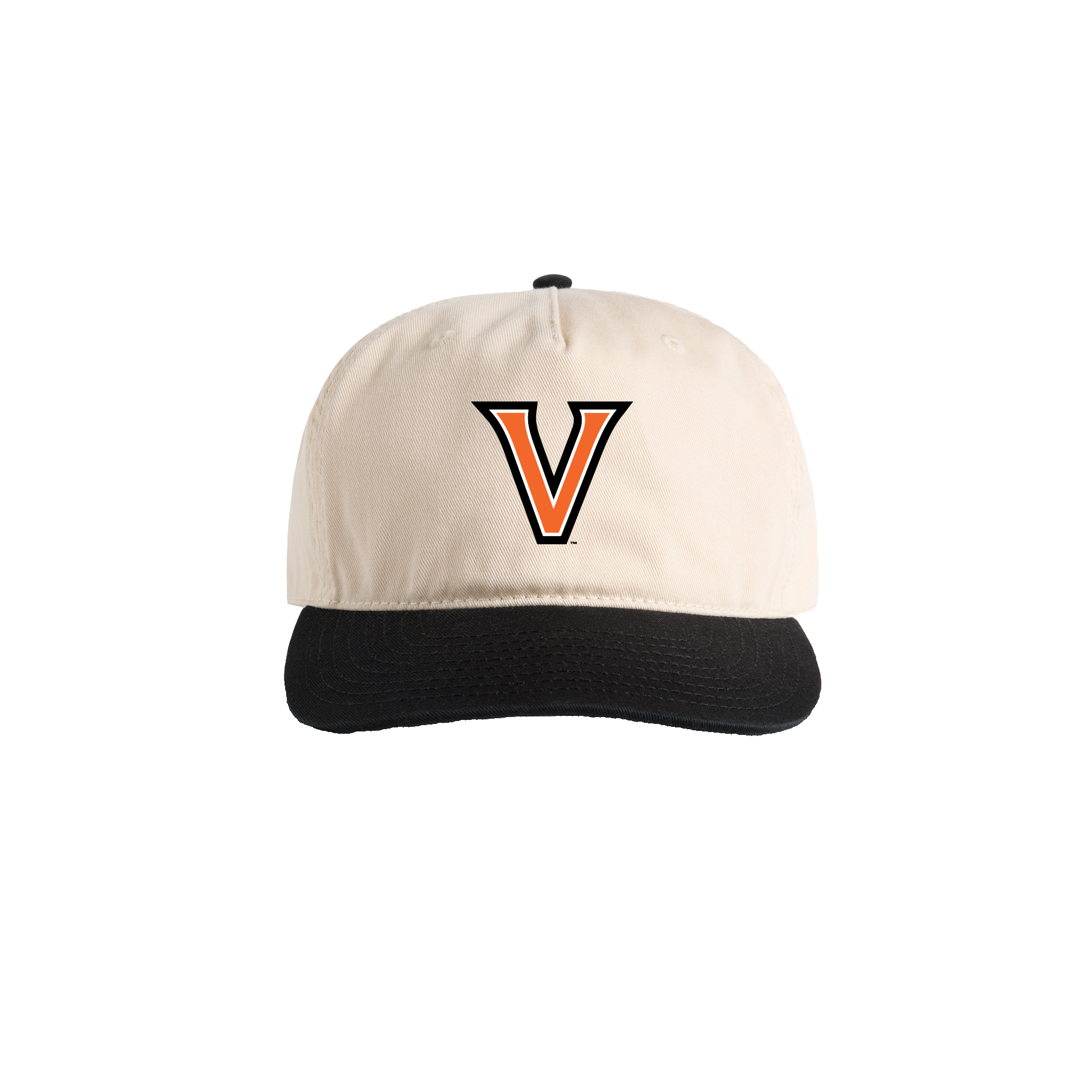 Embroidered V Logo on Five panel cap with contrasting dome & peak. Plastic snapback, tonal eyelets, 100% cotton. Mid Profile